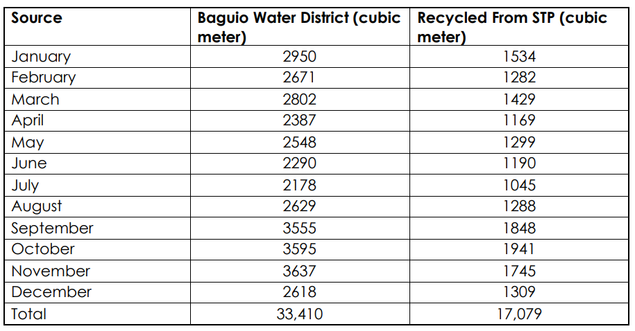 The University of the Cordilleras (UC) recorded a total 2024 water consumption of 33,410 cubic meters from its main supply, the Baguio Water District, of which 17,079 cubic meters were recycled through the university’s treatment system. This remarkably low water footprint reflects the university’s effective conservation measures. Of this total, 17,079 cubic meters came from recycled water processed through UC’s Sewage Treatment Plant (STP), demonstrating its strong commitment to water reuse and sustainable resource management. These efforts strengthen UC’s pursuit of SDG 6: Clean Water and Sanitation.