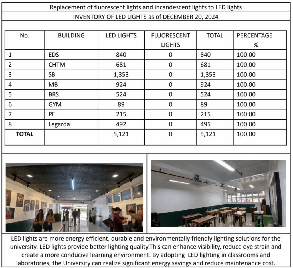 The University consumed a total of 938,689 kWh of electricity in 2024. Energy is primarily used for lighting, mechanical systems, laboratory equipment, and digital learning facilities. With all campus buildings now fully upgraded to LED lighting systems (5,268 units), UC achieved a 100% transition from fluorescent and incandescent bulbs, reducing electricity consumption by 50–70% and minimizing maintenance costs.